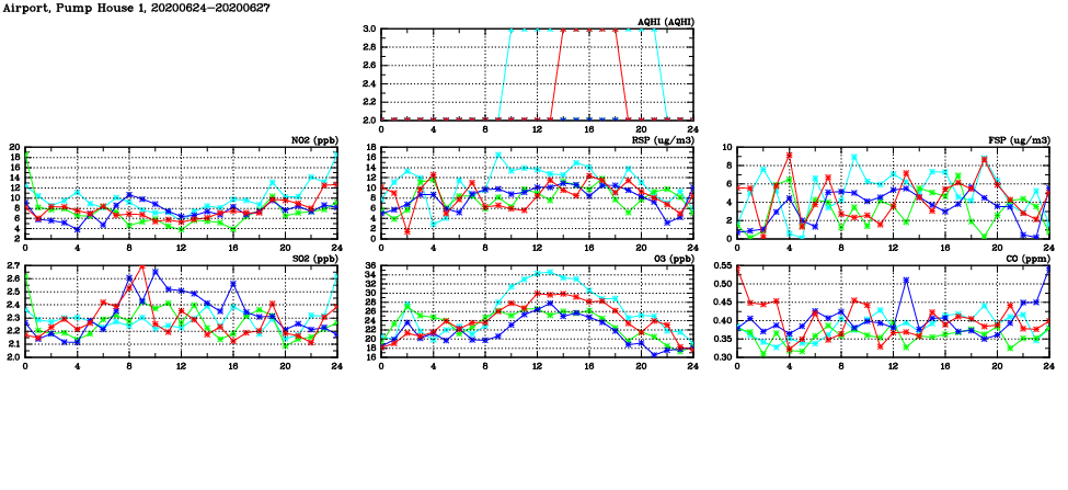 | Air Quality Data Time Series in Airport, Pump House 1 (2020/06/27) | ( Line colors: Day -3 Day -2 Day -1 Current day ) | 2D Map Current AQHI |