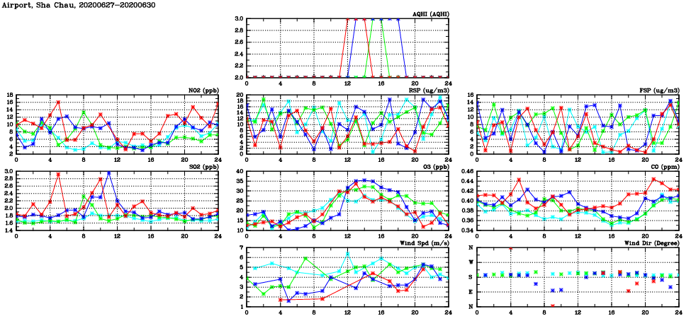 | Air Quality Data Time Series in Airport, Sha Chau (2020/06/30) | ( Line colors: Day -3 Day -2 Day -1 Current day ) | 2D Map Current AQHI |