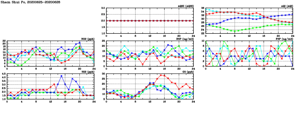 | Air Quality Data Time Series in Sham Shui Po (2020/06/28) | ( Line colors: Day -3 Day -2 Day -1 Current day ) | 2D Map Current AQHI |