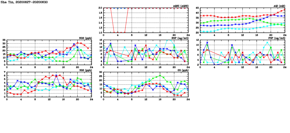 | Air Quality Data Time Series in Sha Tin (2020/06/30) | ( Line colors: Day -3 Day -2 Day -1 Current day ) | 2D Map Current AQHI |