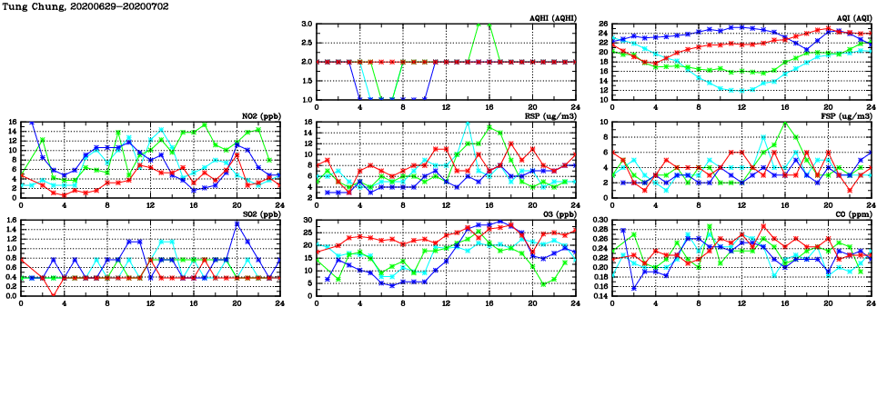 | Air Quality Data Time Series in Tung Chung (2020/07/02) | ( Line colors: Day -3 Day -2 Day -1 Current day ) | 2D Map Current AQHI |
