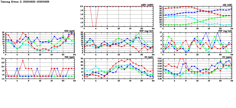 | Air Quality Data Time Series in Tseung Kwan O (2020/06/28) | ( Line colors: Day -3 Day -2 Day -1 Current day ) | 2D Map Current AQHI |