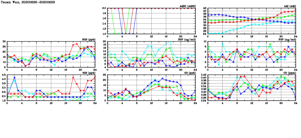 | Air Quality Data Time Series in Tsuen Wan (2020/06/29) | ( Line colors: Day -3 Day -2 Day -1 Current day ) | 2D Map Current AQHI |