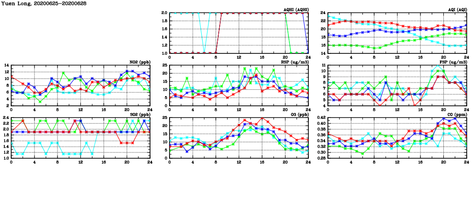 | Air Quality Data Time Series in Yuen Long (2020/06/28) | ( Line colors: Day -3 Day -2 Day -1 Current day ) | 2D Map Current AQHI |