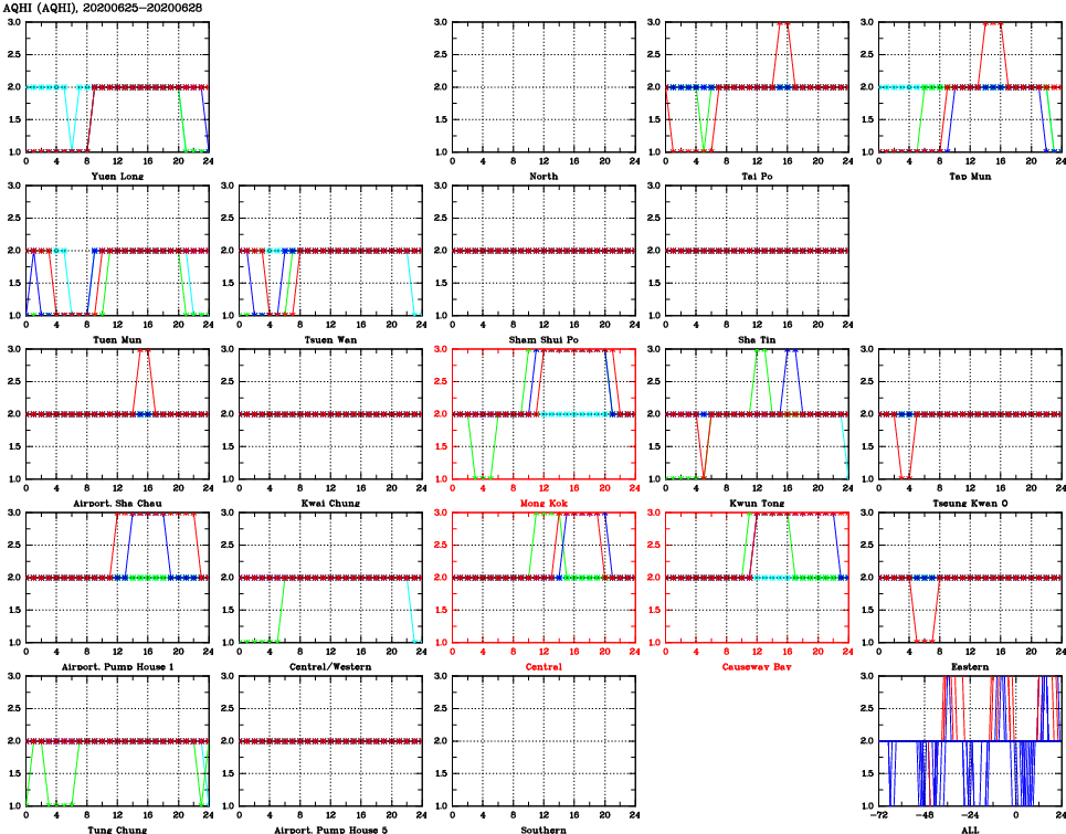 | Air Quality Data Time Series for AQHI (2020/06/28) | ( Line colors: Day -3 Day -2 Day -1 Current day ) | 2D Map Current AQHI |