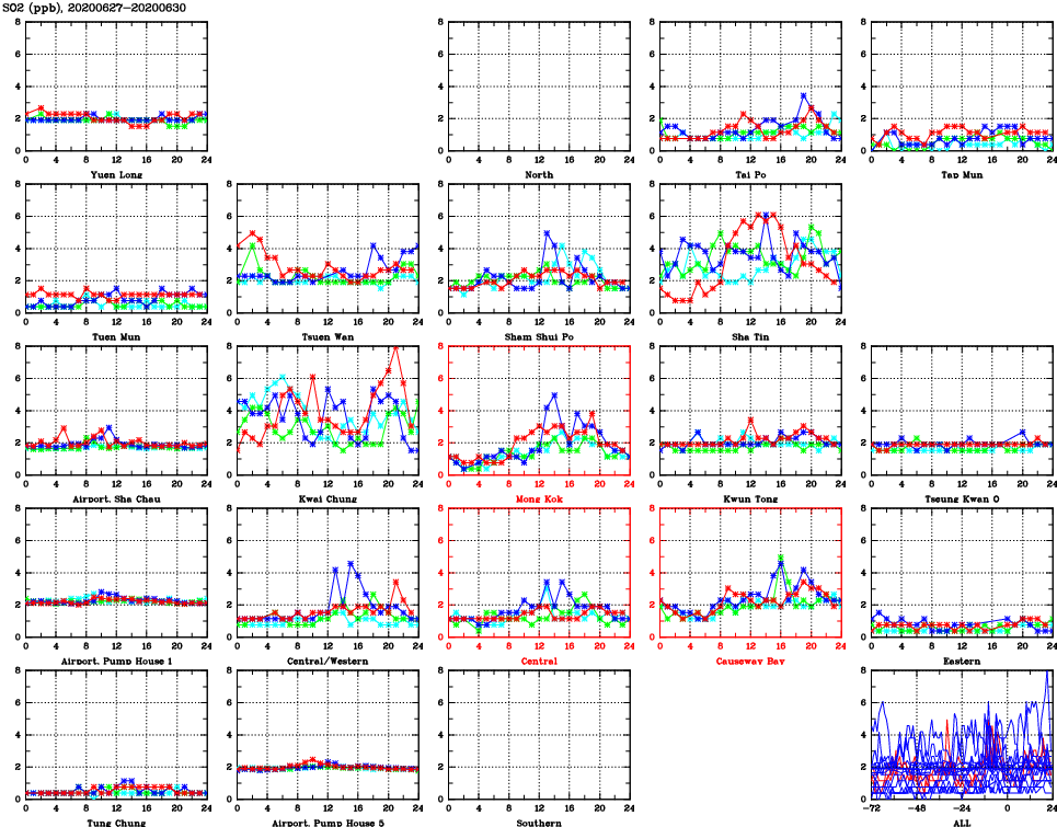 | Air Quality Data Time Series for SO2 (2020/06/30) | ( Line colors: Day -3 Day -2 Day -1 Current day ) | 2D Map Current AQHI |