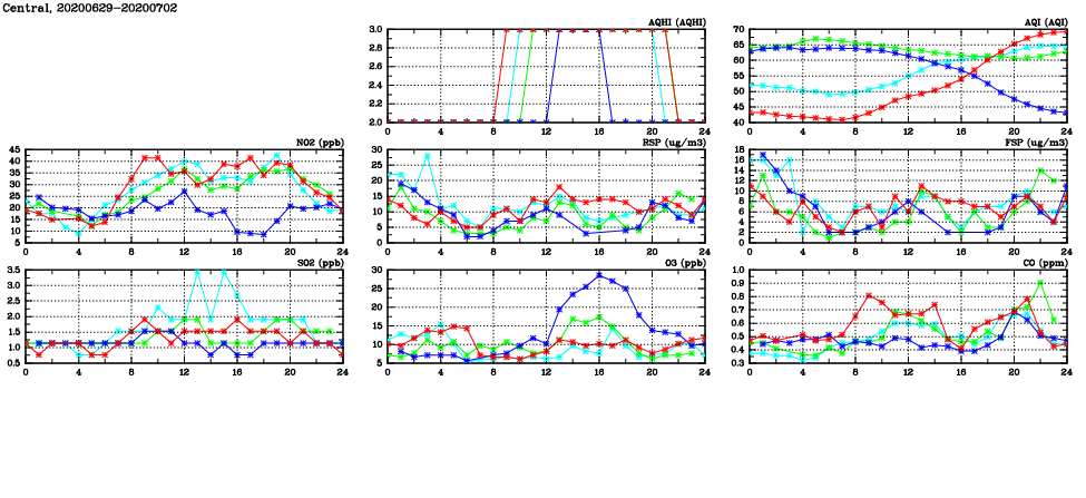 | Air Quality Data Time Series in Central (2020/07/02) | ( Line colors: Day -3 Day -2 Day -1 Current day ) | 2D Map Current AQHI |