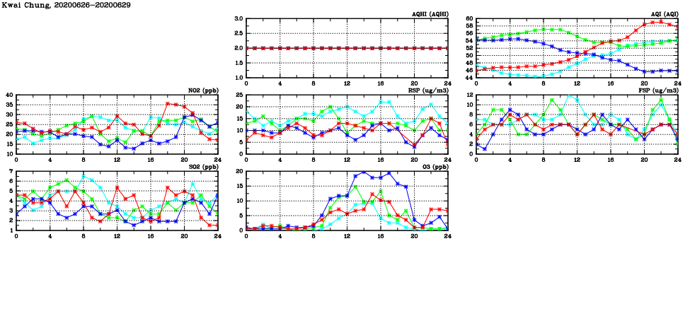 | Air Quality Data Time Series in Kwai Chung (2020/06/29) | ( Line colors: Day -3 Day -2 Day -1 Current day ) | 2D Map Current AQHI |