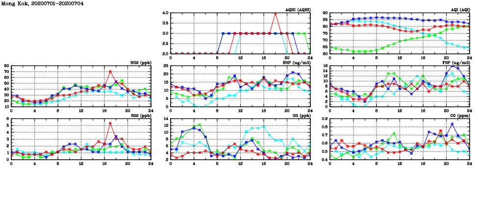 | Air Quality Data Time Series in Mong Kok (2020/07/04) | ( Line colors: Day -3 Day -2 Day -1 Current day ) | 2D Map Current AQHI |