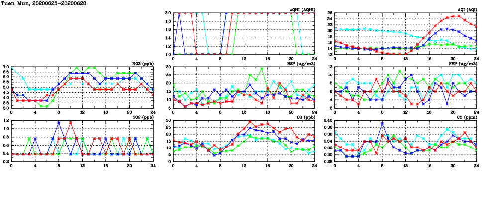 | Air Quality Data Time Series in Tuen Mun (2020/06/28) | ( Line colors: Day -3 Day -2 Day -1 Current day ) | 2D Map Current AQHI |