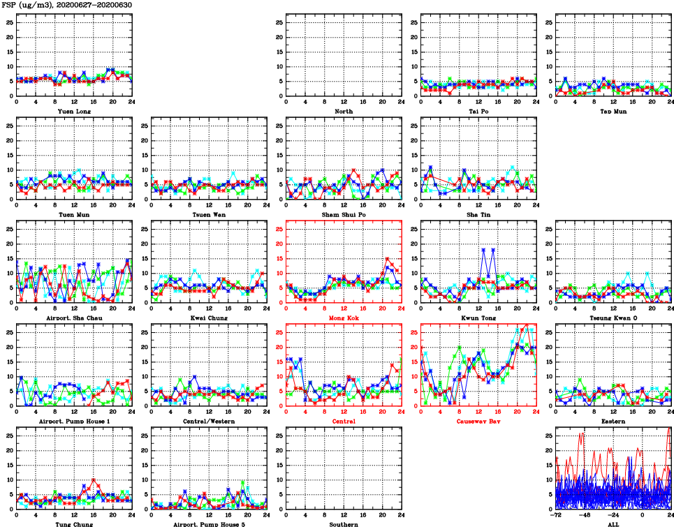 | Air Quality Data Time Series for FSP (2020/06/30) | ( Line colors: Day -3 Day -2 Day -1 Current day ) | 2D Map Current AQHI |
