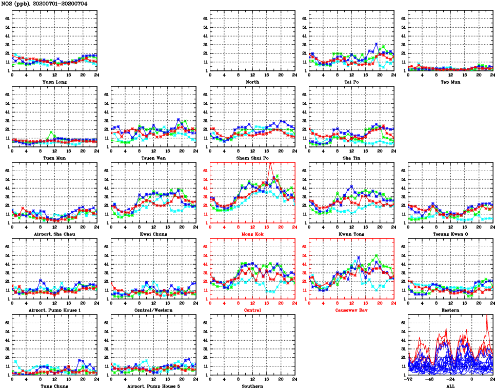 | Air Quality Data Time Series for NO2 (2020/07/04) | ( Line colors: Day -3 Day -2 Day -1 Current day ) | 2D Map Current AQHI |