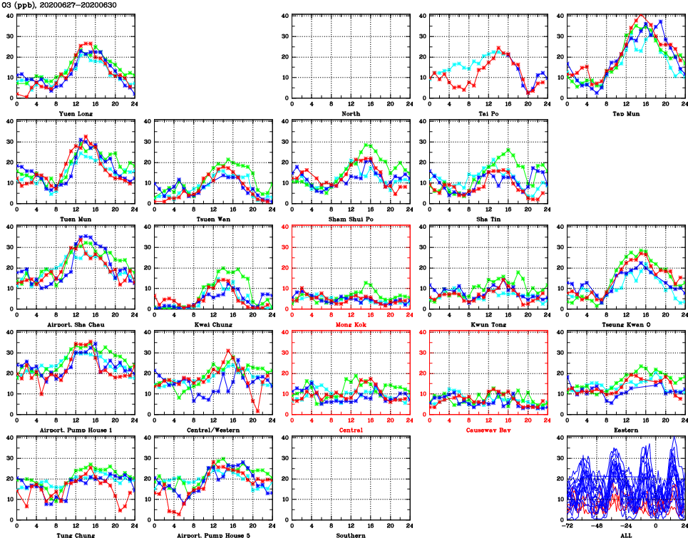 | Air Quality Data Time Series for O3 (2020/06/30) | ( Line colors: Day -3 Day -2 Day -1 Current day ) | 2D Map Current AQHI |