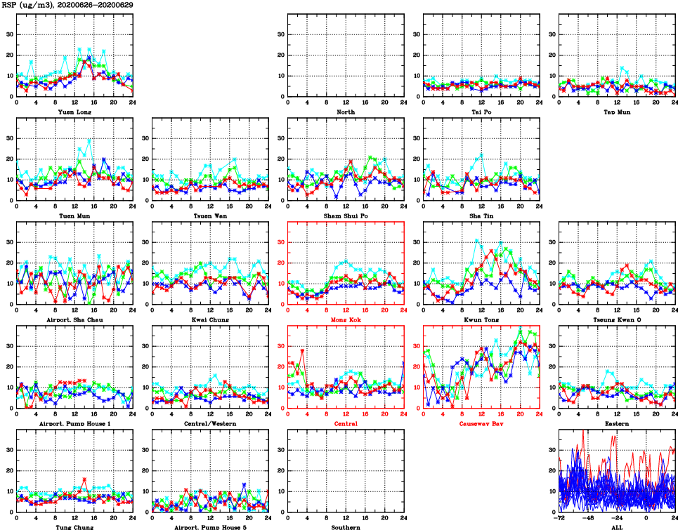 | Air Quality Data Time Series for RSP (2020/06/29) | ( Line colors: Day -3 Day -2 Day -1 Current day ) | 2D Map Current AQHI |