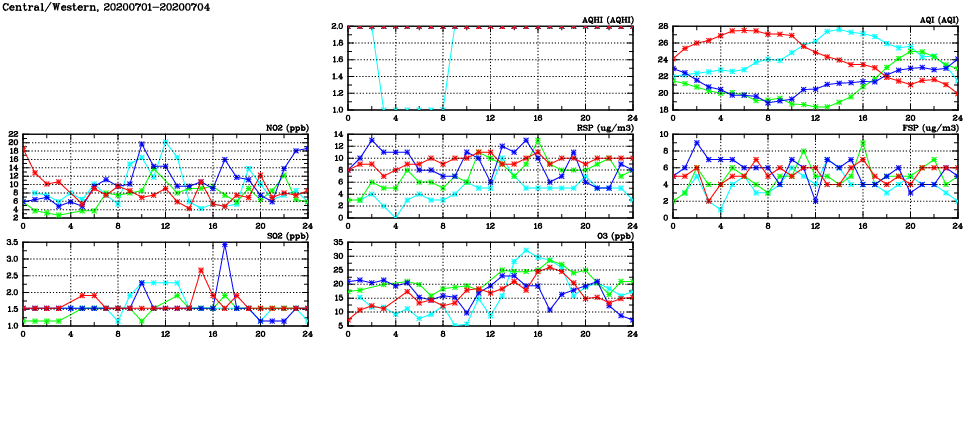| Air Quality Data Time Series in Central/Western (2020/07/04) | ( Line colors: Day -3 Day -2 Day -1 Current day ) | 2D Map Current AQHI |
