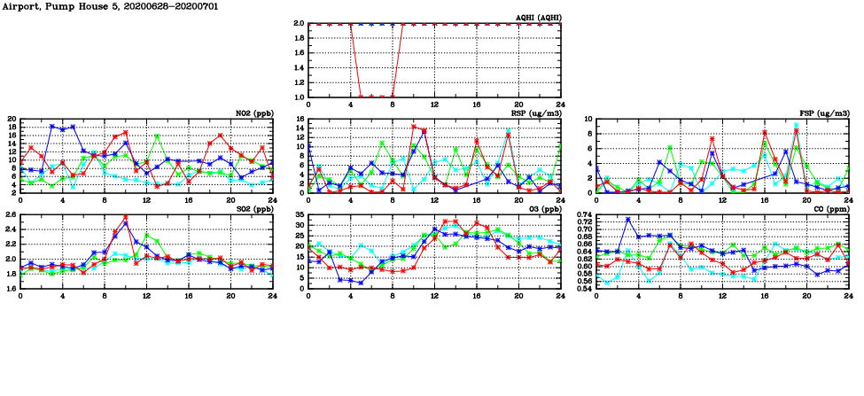 | Air Quality Data Time Series in Airport, Pump House 5 (2020/07/01) | ( Line colors: Day -3 Day -2 Day -1 Current day ) | 2D Map Current AQHI |