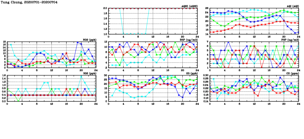 | Air Quality Data Time Series in Tung Chung (2020/07/04) | ( Line colors: Day -3 Day -2 Day -1 Current day ) | 2D Map Current AQHI |