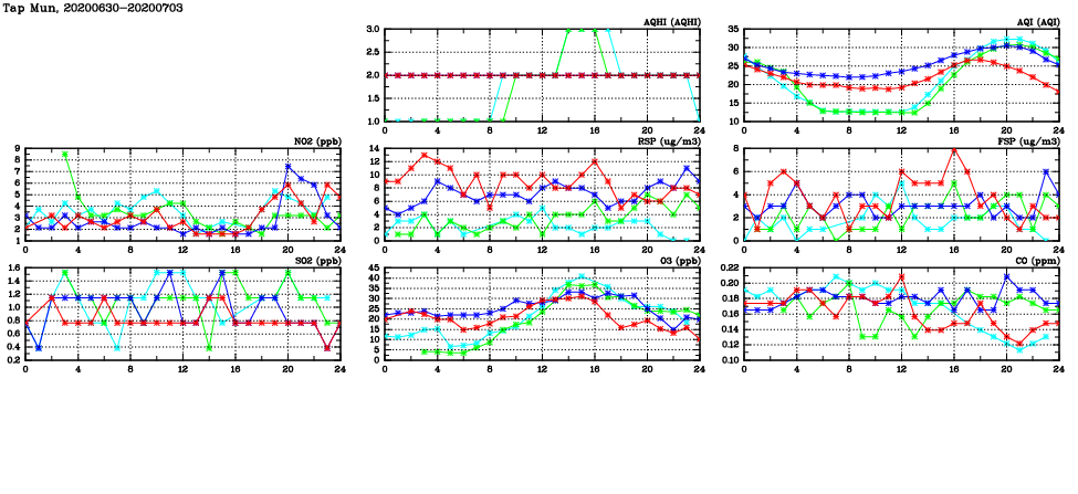 | Air Quality Data Time Series in Tap Mun (2020/07/03) | ( Line colors: Day -3 Day -2 Day -1 Current day ) | 2D Map Current AQHI |