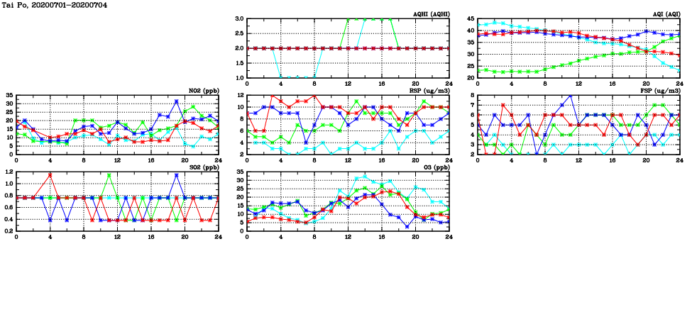| Air Quality Data Time Series in Tai Po (2020/07/04) | ( Line colors: Day -3 Day -2 Day -1 Current day ) | 2D Map Current AQHI |