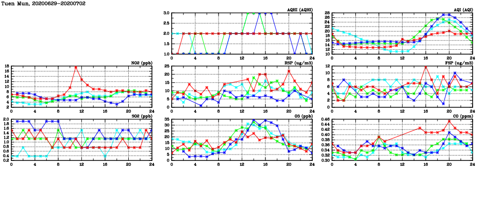 | Air Quality Data Time Series in Tuen Mun (2020/07/02) | ( Line colors: Day -3 Day -2 Day -1 Current day ) | 2D Map Current AQHI |