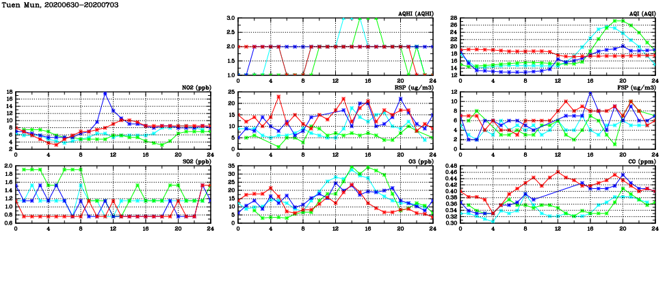 | Air Quality Data Time Series in Tuen Mun (2020/07/03) | ( Line colors: Day -3 Day -2 Day -1 Current day ) | 2D Map Current AQHI |