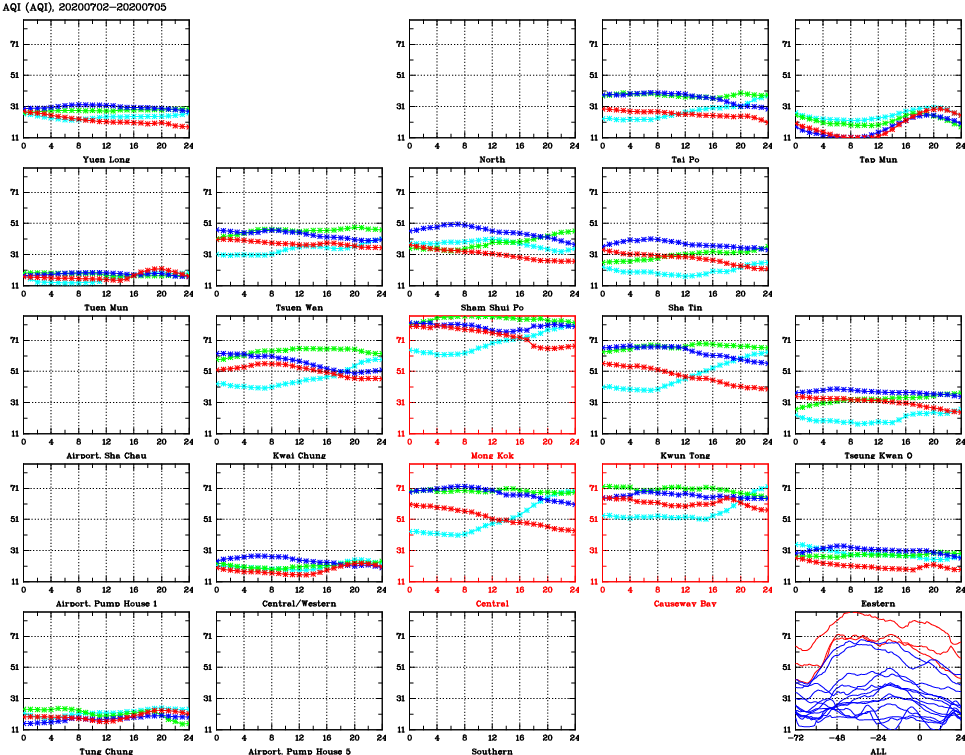 | Air Quality Data Time Series for AQI (2020/07/05) | ( Line colors: Day -3 Day -2 Day -1 Current day ) | 2D Map Current AQHI |