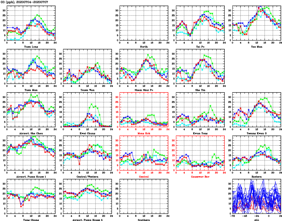 | Air Quality Data Time Series for O3 (2020/07/07) | ( Line colors: Day -3 Day -2 Day -1 Current day ) | 2D Map Current AQHI |