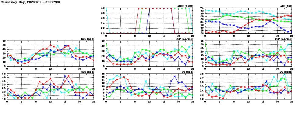 | Air Quality Data Time Series in Causeway Bay (2020/07/06) | ( Line colors: Day -3 Day -2 Day -1 Current day ) | 2D Map Current AQHI |