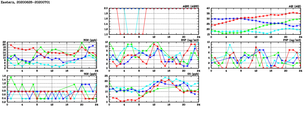 | Air Quality Data Time Series in Eastern (2020/07/01) | ( Line colors: Day -3 Day -2 Day -1 Current day ) | 2D Map Current AQHI |
