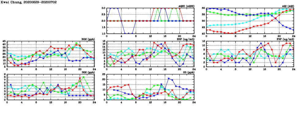 | Air Quality Data Time Series in Kwai Chung (2020/07/02) | ( Line colors: Day -3 Day -2 Day -1 Current day ) | 2D Map Current AQHI |