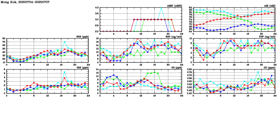 | Air Quality Data Time Series in Mong Kok (2020/07/07) | ( Line colors: Day -3 Day -2 Day -1 Current day ) | 2D Map Current AQHI |