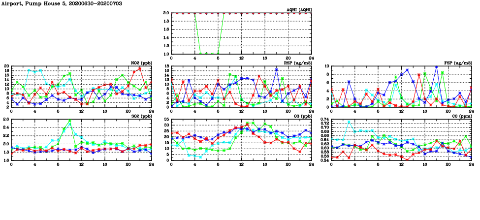 | Air Quality Data Time Series in Airport, Pump House 5 (2020/07/03) | ( Line colors: Day -3 Day -2 Day -1 Current day ) | 2D Map Current AQHI |