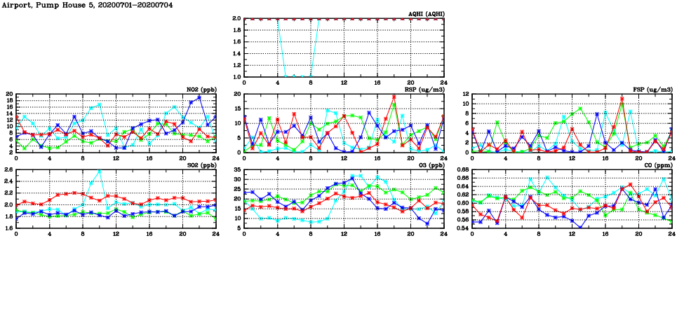 | Air Quality Data Time Series in Airport, Pump House 5 (2020/07/04) | ( Line colors: Day -3 Day -2 Day -1 Current day ) | 2D Map Current AQHI |