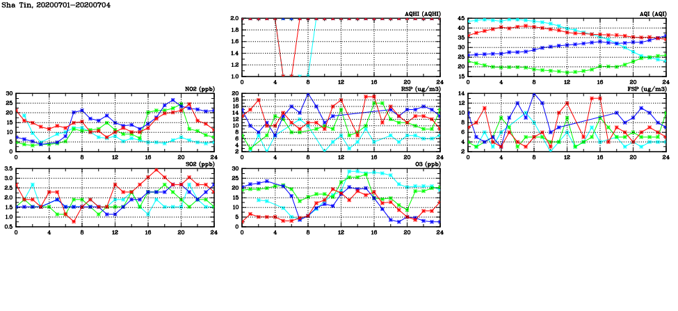 | Air Quality Data Time Series in Sha Tin (2020/07/04) | ( Line colors: Day -3 Day -2 Day -1 Current day ) | 2D Map Current AQHI |