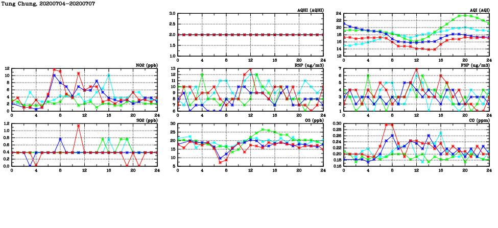 | Air Quality Data Time Series in Tung Chung (2020/07/07) | ( Line colors: Day -3 Day -2 Day -1 Current day ) | 2D Map Current AQHI |