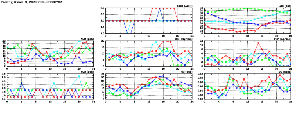 | Air Quality Data Time Series in Tseung Kwan O (2020/07/02) | ( Line colors: Day -3 Day -2 Day -1 Current day ) | 2D Map Current AQHI |