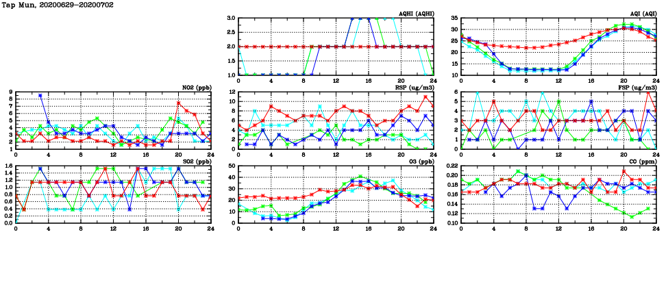 | Air Quality Data Time Series in Tap Mun (2020/07/02) | ( Line colors: Day -3 Day -2 Day -1 Current day ) | 2D Map Current AQHI |