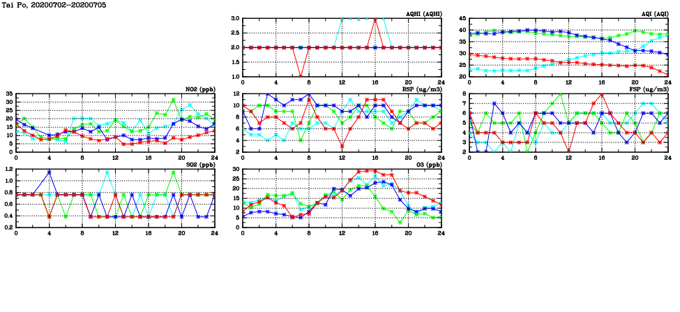 | Air Quality Data Time Series in Tai Po (2020/07/05) | ( Line colors: Day -3 Day -2 Day -1 Current day ) | 2D Map Current AQHI |