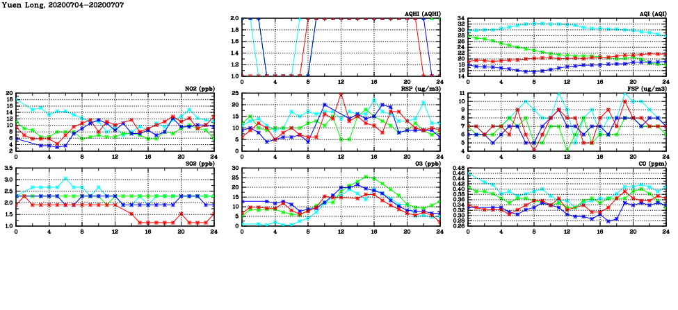 | Air Quality Data Time Series in Yuen Long (2020/07/07) | ( Line colors: Day -3 Day -2 Day -1 Current day ) | 2D Map Current AQHI |