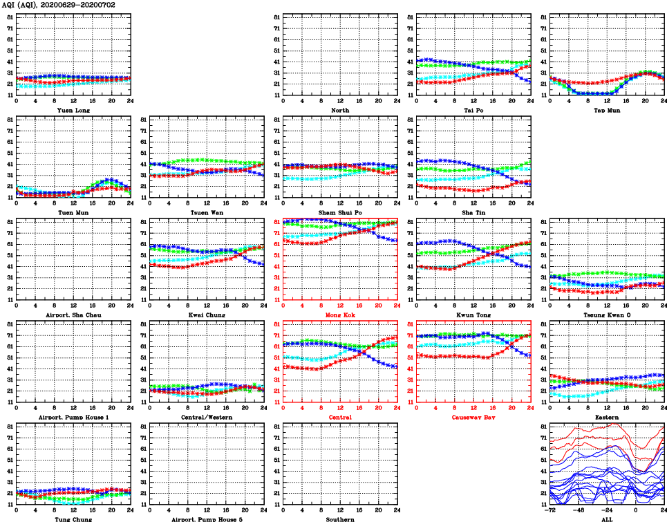 | Air Quality Data Time Series for AQI (2020/07/02) | ( Line colors: Day -3 Day -2 Day -1 Current day ) | 2D Map Current AQHI |