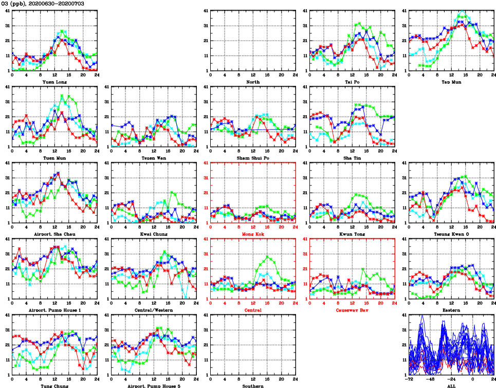| Air Quality Data Time Series for O3 (2020/07/03) | ( Line colors: Day -3 Day -2 Day -1 Current day ) | 2D Map Current AQHI |