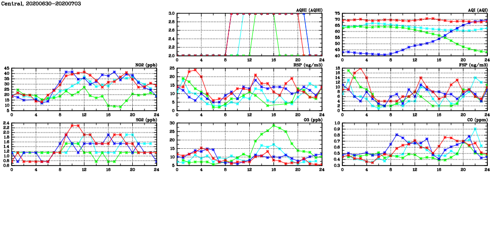 | Air Quality Data Time Series in Central (2020/07/03) | ( Line colors: Day -3 Day -2 Day -1 Current day ) | 2D Map Current AQHI |