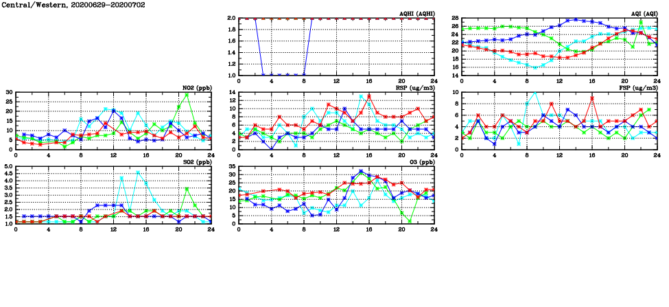 | Air Quality Data Time Series in Central/Western (2020/07/02) | ( Line colors: Day -3 Day -2 Day -1 Current day ) | 2D Map Current AQHI |
