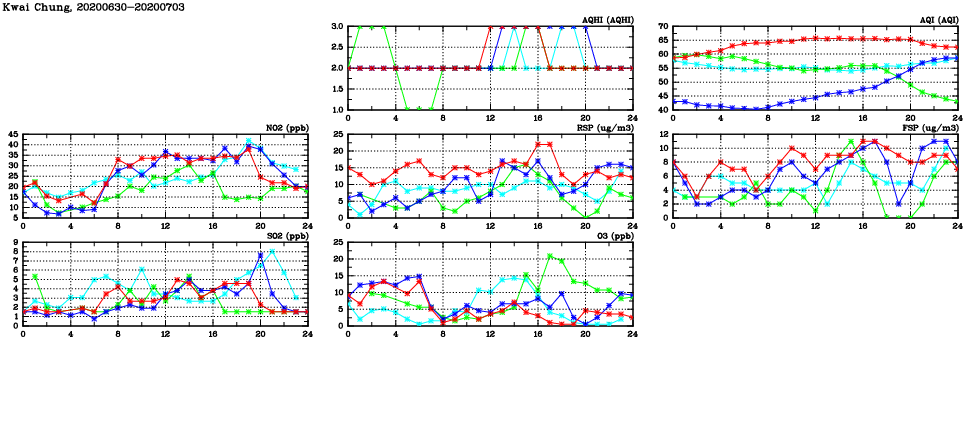 | Air Quality Data Time Series in Kwai Chung (2020/07/03) | ( Line colors: Day -3 Day -2 Day -1 Current day ) | 2D Map Current AQHI |