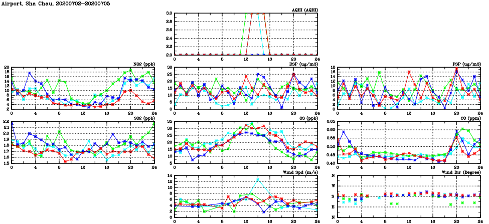 | Air Quality Data Time Series in Airport, Sha Chau (2020/07/05) | ( Line colors: Day -3 Day -2 Day -1 Current day ) | 2D Map Current AQHI |