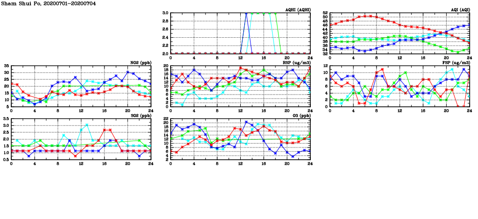 | Air Quality Data Time Series in Sham Shui Po (2020/07/04) | ( Line colors: Day -3 Day -2 Day -1 Current day ) | 2D Map Current AQHI |