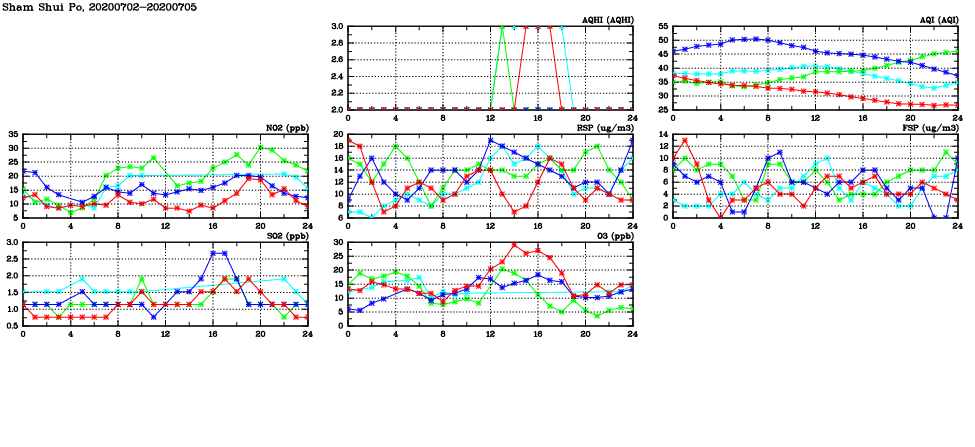 | Air Quality Data Time Series in Sham Shui Po (2020/07/05) | ( Line colors: Day -3 Day -2 Day -1 Current day ) | 2D Map Current AQHI |
