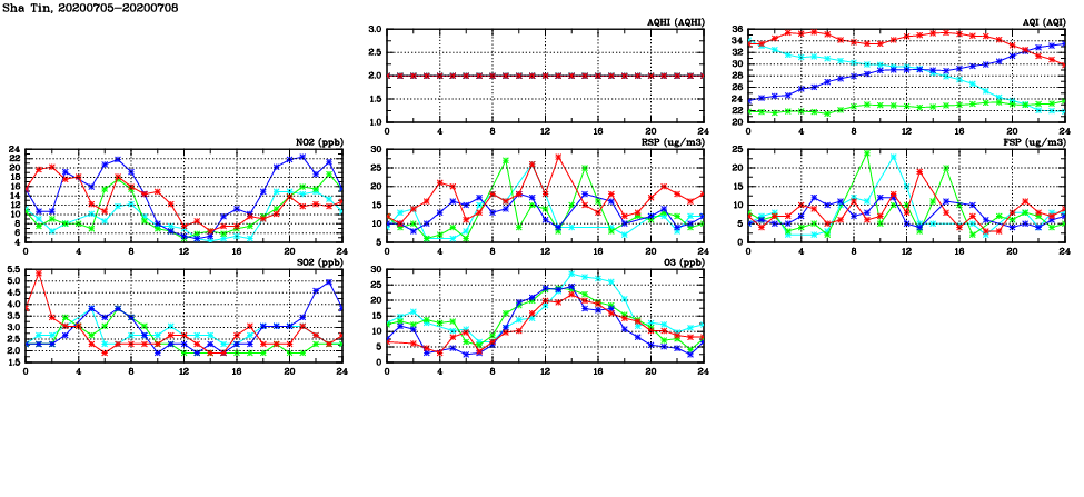 | Air Quality Data Time Series in Sha Tin (2020/07/08) | ( Line colors: Day -3 Day -2 Day -1 Current day ) | 2D Map Current AQHI |
