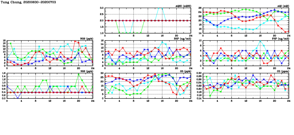| Air Quality Data Time Series in Tung Chung (2020/07/03) | ( Line colors: Day -3 Day -2 Day -1 Current day ) | 2D Map Current AQHI |
