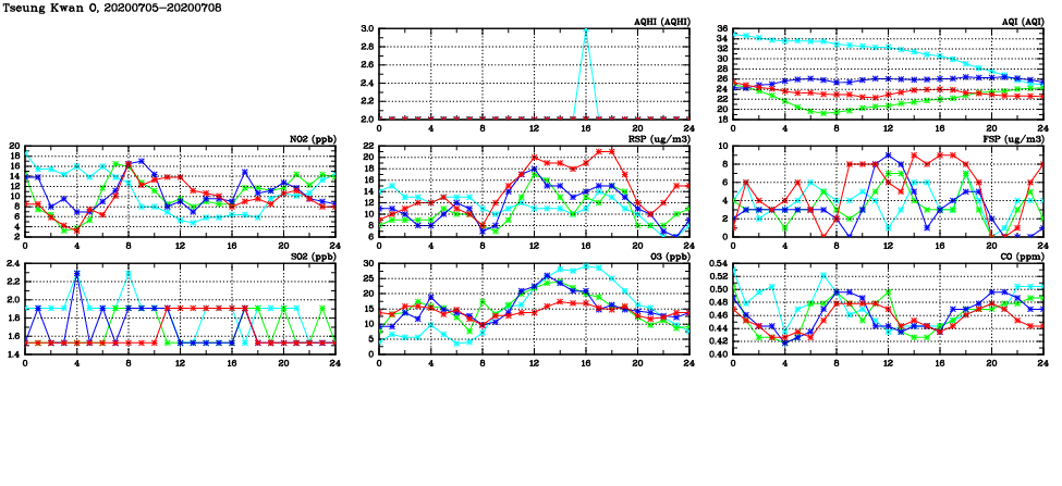 | Air Quality Data Time Series in Tseung Kwan O (2020/07/08) | ( Line colors: Day -3 Day -2 Day -1 Current day ) | 2D Map Current AQHI |